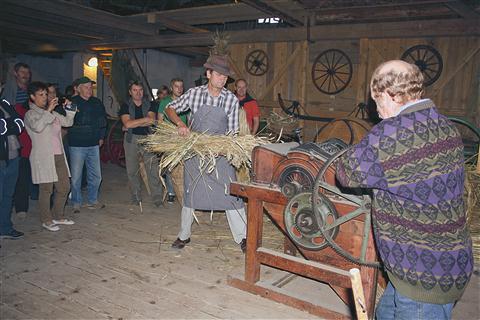 Ob našem obisku je ravno poprijel za harmoniko in pospremil skupino obiskovalcev v zbirko. Hip za tem je vrtel cep, mlatil žito, rezal slamo in nato pripovedoval in razlagal, kako so njega dni ...